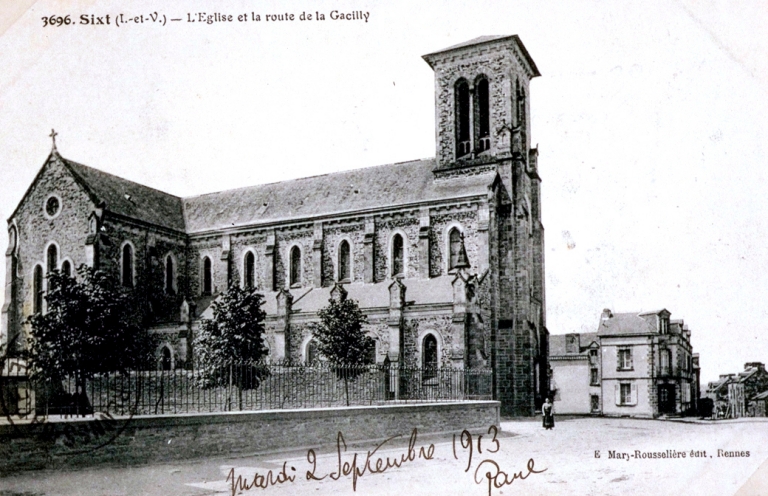 3696. Sixt (I.-et-V.) - L'Eglise et la route de la Gacilly, carte postale, E. Mary-Rousselière édit., Rennes, début 20e siècle (collection particulière).