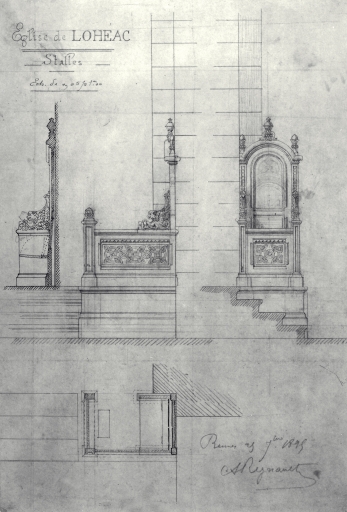 Elévation et plan des stalles, crayon papier et encre de chine sur calque, signé Arthur Regnault, 25 septembre 1895. (A. D. d'Ille-et-Vilaine, fonds Arthur Regnault).