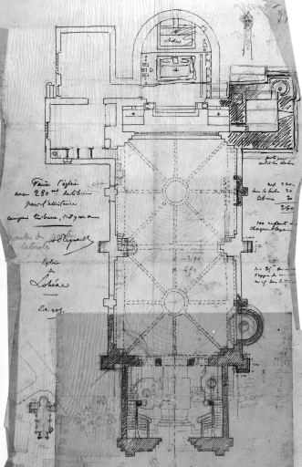Projet de l'escalier de la chaire ; développement en plan, crayon papier sur calque, signé Arthur Regnault, 1895. (A. D. d'Ille-et-Vilaine, fonds Arthur Regnault).
