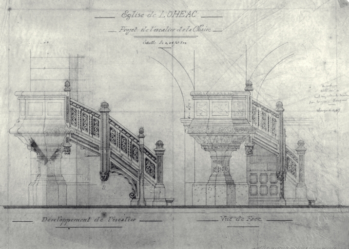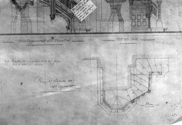 Projet de l'escalier de la chaire ; développement, vue de face, crayon papier sur calque, signé Arthur Regnault, 25 septembre 1895. (A. D. d'Ille-et-Vilaine, fonds Arthur Regnault).