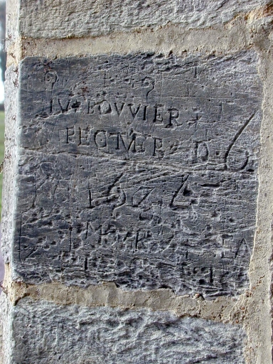 En façade nord, sous la cloche (remplacée il y a quelques années), une pierre porte la date 1660. En façade nord, sur le montant gauche de la porte à coussinets, inscription difficilement lisible : "IV (?) BOUVIER RECTMER D 6 1674 [...]".