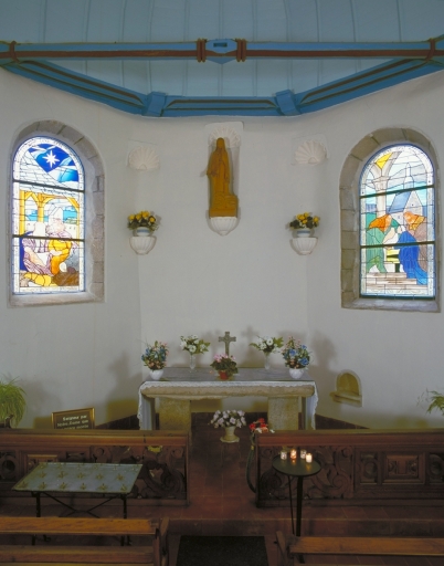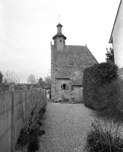 Plan massé, un vaisseau ; lambris de couvrement ; chevet à pans coupés ; toit à longs pans, croupe, pignon découvert, flèche conique ; escalier hors œuvre, escalier à vis sans jour.