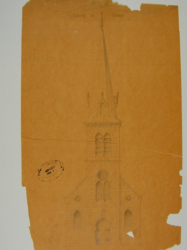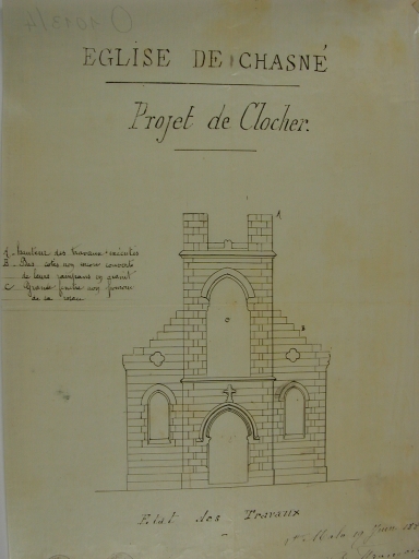 Eglise de Chasné. Projet de clocher. Etat des travaux. Dessin par Alfred Frangeul, architecte, 1880, plume et encre de chine sur toile vernie. (A.D. Ille-et-Vilaine : série O 1013/4).