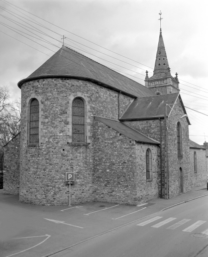 Eglise désorientée. Chevet circulaire. Clocher-porche.