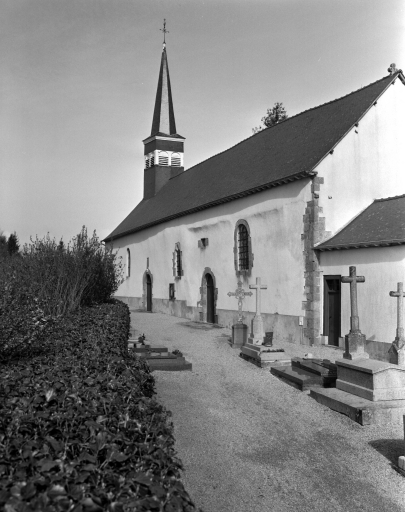 L’église romane possède une nef à chevet droit. C’est une formule de plan simple qui a été très répandue en Bretagne à l’époque romane, à l’image de l’église du Lou-du-Lac. Sans aucun contrefort, avec une épaisseur de mur inhabituelle (plus de 1,20m) l’édifice tient depuis plusieurs siècles. L’église a conservé sur sa façade nord quatre baies romanes hautes et étroites, dites “ en meurtrière “. La façade sud a été reconstruite au 16e siècle, comme en témoigne la troisième baie, gothique en arc trilobé ou l’ancien cintre reste encore apparent.