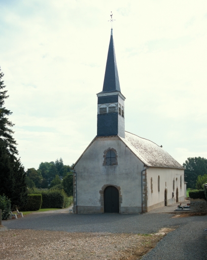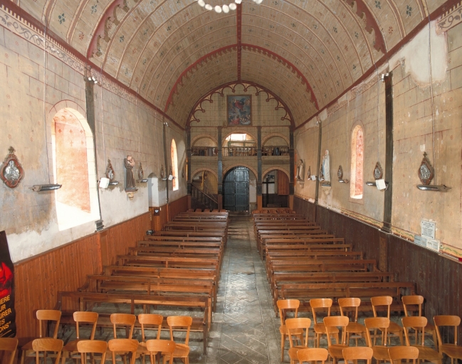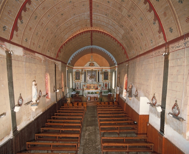 Plan allongé. Choeur à chevet plat situé dans le prolongement du vaisseau unique de la nef. Pignon du chevet sommé d'une croix en pierre. Lambris de couvrement pour l'intérieur.