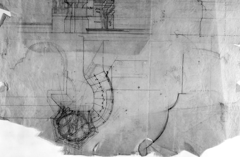 Thorigné. Eglise paroissiale Saint-Melaine. Plan de la chaire et du pilier à droite de l'entrée du choeur. Plan attribué à Arthur Regnault, [s.d.], encre et crayon sur papier. (A.D. Ille-et-Vilaine : 35 Fi, fonds Arthur Regnault).
