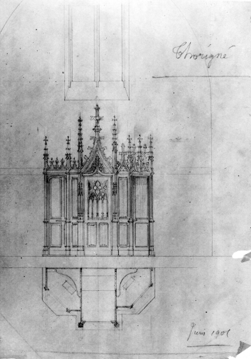 Thorigné. Eglise paroissiale Saint-Melaine. Elévation du confessionnal. Plan attribué à Arthur Regnault, 1901, crayon sur calque. (A.D. Ille-et-Vilaine : 35 Fi, fonds Arthur Regnault).
