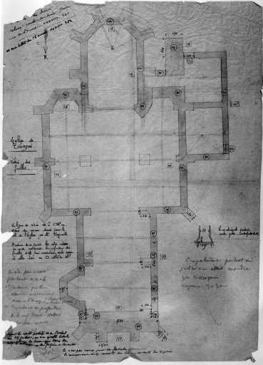 Plan au sol, relevé des fouilles de l'église. Plan signé A. Regnault, [s. d.], encre de chine et lavis rouge sur calque. (A.D. Ille-et-Vilaine : 35 Fi, fonds Arthur Regnault).