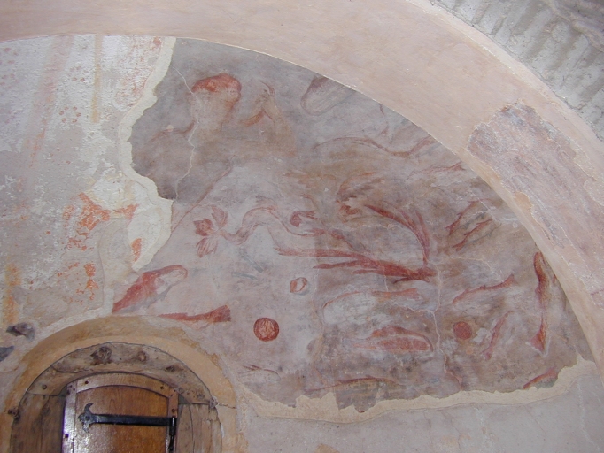 Plan allongé, 1 vaisseau, cul de four, appareil alterné de grès et de brique. Décor : peinture. Représentation : scène mythologique, déesses, poisson. Sujet : Vénus sortant des eaux, support : cul-de-four de l'abside. Toit à longs pans ; pignon couvert ; croupe ronde.