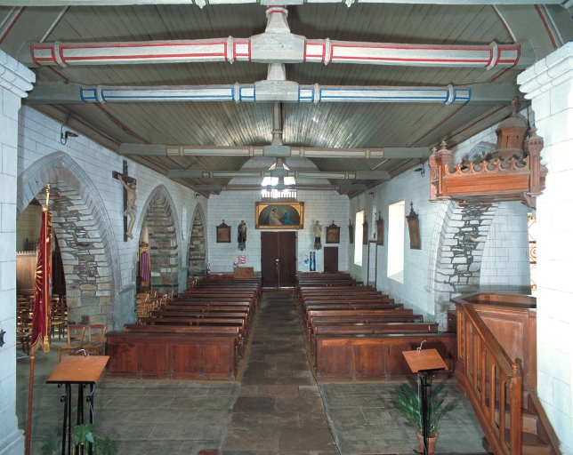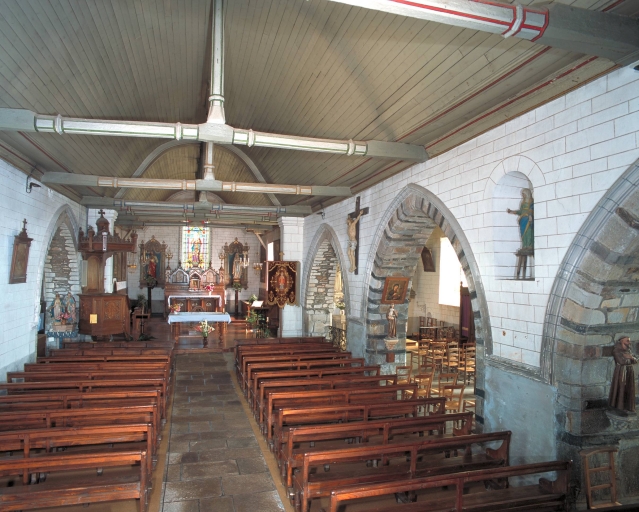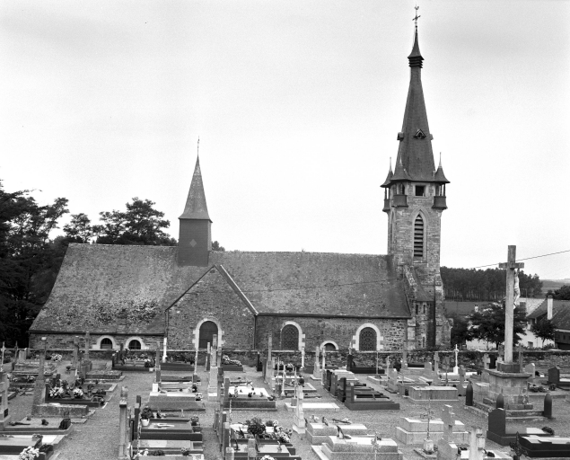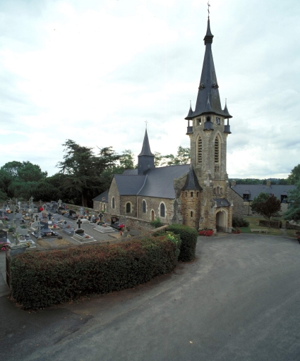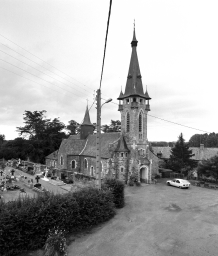 Plan en croix latine ; 2 vaisseaux ; lambris de couvrement. Toit à longs pans, noue, flèche polygonal, flèche en maçonnerie, pignon couvert, toit en pavillon, appentis. Escalier hors-oeuvre, escalier en vis avec jour. Décor : vitrail. Clocher médian, clocher-porche, chevet plat.