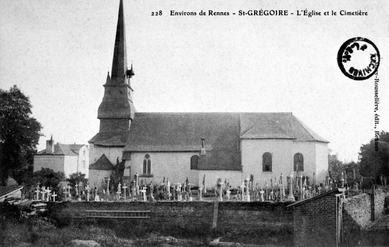 L´église dédiée à Saint-Grégoire, le plus grand pape du premier millénaire est donnée au 11e ou 12e siècle par le chevalier Halenaud au chapître de Rennes. De cette époque ne subsiste que le gros-oeuvre de la nef. Une fenêtre du mur nord témoigne de travaux réalisés au 14e siècle ? Il semble que l´église soit rebâtie en quasi-totalité vers 1407. Le clocher élevé quant à lui au 17e siècle conserve une date portée de 1672. De nombreux remaniements sont également attestés aux 19e et 20e siècles. En 1835, une demande est établie par la commune pour réparer et agrandir l´église du fait de son mauvais état et de son insuffisance relative à accueillir du monde. Aussi, vers 1836, l´abside a-t-elle été démolie, l´église allongée de huit mètres, le choeur transféré à l´ouest en ouvrant une grande porte à l´est, la chapelle de Launay abattue et un transept édifié. En 1871, l´architecte Pateu restaure le clocher du 17e siècle après un incendie causé par la foudre. En 1972, elle a été restaurée. Le cimetière a été récemment déplacé, néanmoins quelques tombes, de personnages illustres de la commune, ont été conservées contre le mur extérieur sud de la nef.