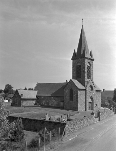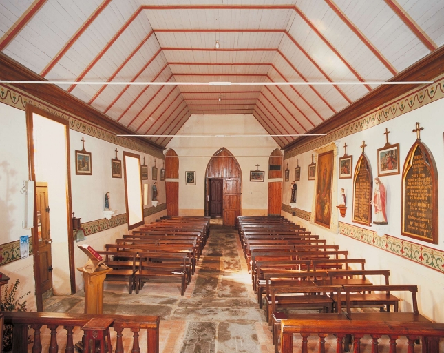 Plan allongé. Un vaisseau. Lambris de couvrement. Chevet plat. Clocher-porche. Appareillage avec tessons de brique dans les murs de la nef.