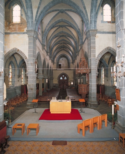 Plan en croix latine, voûte d' ogives, clocher-porche, chevet à pans coupés, style néo-gothique. Plan en croix latine, 3 vaisseaux. Toit à longs pans ; noue ; croupe polygonale ; appentis ; pignon découvert ; flèche en maçonnerie. Escalier hors-oeuvre ; escalier en vis avec jour. Clocher-porche ; chevet à pans coupés ; style néo-gothique.