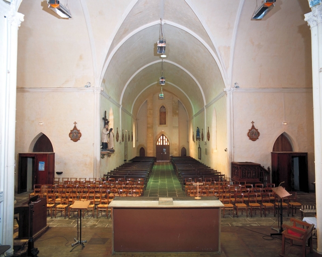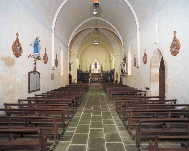 Plan en croix latine, 1 vaisseau, fausse voûte en berceau brisé, clocher-porche, chevet plat. Toit à longs pans ; noue ; pignon découvert ; flèche en maçonnerie.