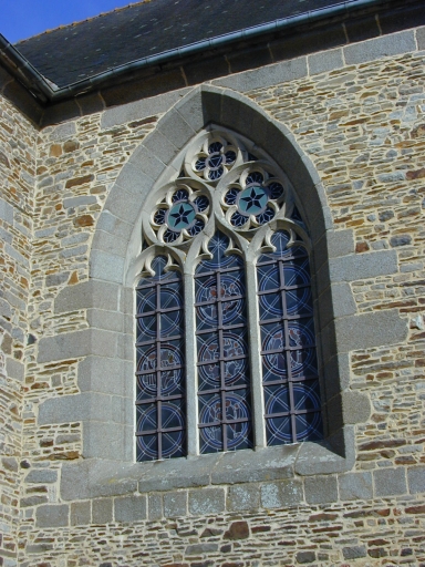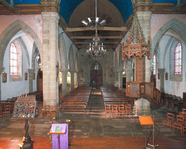 Plan en croix latine, 3 vaisseaux. Lambris de couvrement. Sculpture ; vitrail ; peinture ; représentation : animal fantastique. Support : charpente et sablières. Toit à longs pans ; noue ; pignon couvert ; pignon découvert ; flèche en maçonnerie. Clocher-porche, façade latérale à pignons multiples, chevet plat.