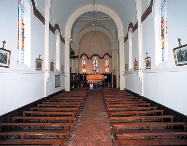 Plan en croix latine à un vaisseau. Clocher en façade ou en bas de nef avec flèche en maçonnerie. Chevet à pans coupés. Style néogothique.