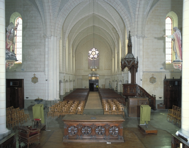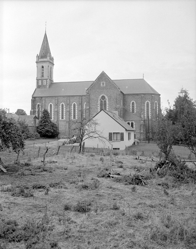 Plan en croix latine, fausse voûte d'ogives, clocher en façade, chevet à pans coupés. De style néo-gothique. Couverture : toit à longs pans, pignon découvert, noue, croupe, flèche en maçonnerie. Décor : vitrail.