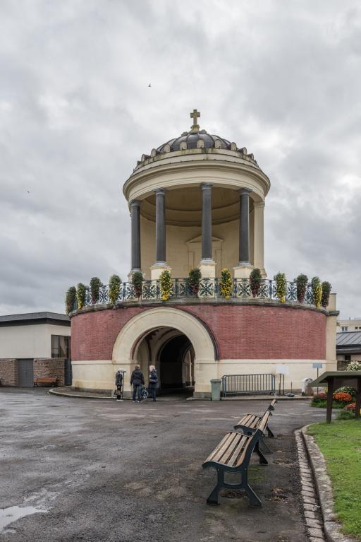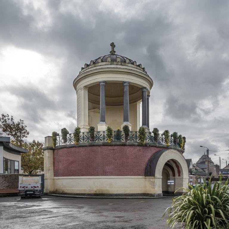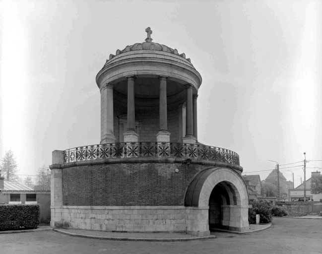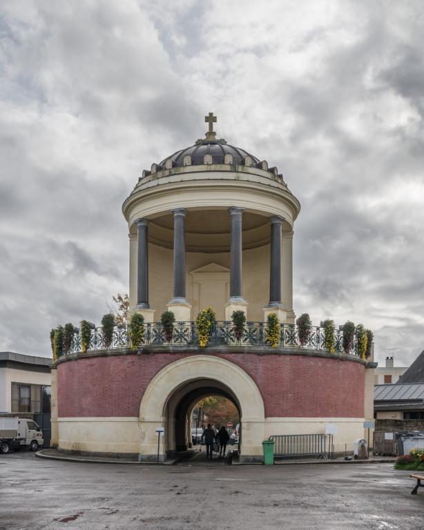 - PINTE Édifice unique dans sa typologie, comme dans la carrière de Charles Millardet, architecte majeur à Rennes dans la première moitié du 19e siècle. Première oeuvre rennaise de l'architecte Charles Millardet, après sa nomination au poste d'architecte de la Ville, en 1828, la chapelle funéraire du cimetière du Nord est une commande du maire Lorgeril, soucieux de l'embellissement de la cité, qui s'était également adressé à l'architecte nantais Mathurin Crucy, pour ce projet. L'avenue du Gros-Mahlon, aménagée vers 1860, contribue à valoriser cet édifice néo-classique de très grande qualité, mentionné par l'un des grands historiens de l'architecture française : Louis Hautecoeur. L'édifice de plan circulaire, achevé en 1833, comporte une chapelle ouverte pour la célébration des messes, à l'étage, et devait abriter, tel un panthéon, les cendres des personnages illustres, au niveau du rez-de-chaussée. Les accès latéraux, prévus par l'architecte, furent délaissés au profit du passage cocher central qui ne devait initialement servir qu'au moment de grandes célébrations.