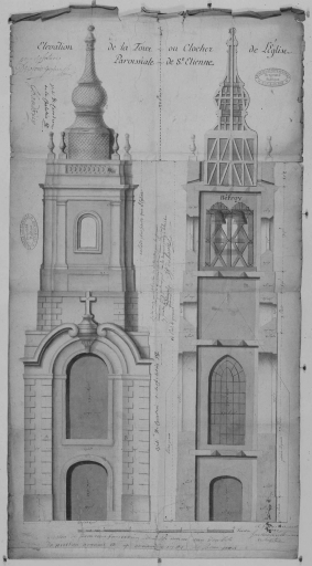 Elévation de la tour ou clocher de l'église paroissiale de Saint-Etienne, dessin, par Forestier de Villeneuve, 1741 (A. D. Ille-et-Vilaine, G 527).
