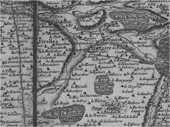 Carte de la France, Rennes, feuille 97, réalisée sous la direction de César-François Cassini de Thury, levé vers 1783 à l'échelle de 1 ligne pour 100 toises [environ 1/86 400].