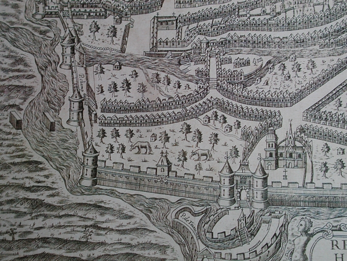 [1616]. Rennes, ville capitale de Bretagne et siège du Parlement 1616, fac-similé du plan de l'Histoire de Bretagne de Bertrand d'Argentré, 3 éd., 1618 (A. C. Rennes ; 1 FI 42).