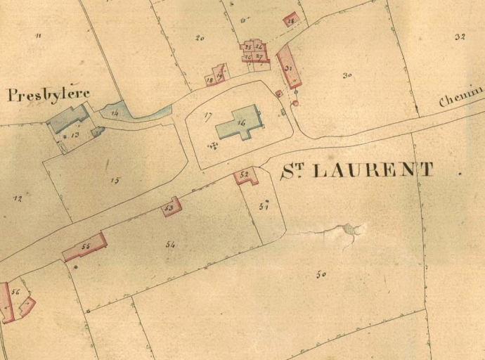 Selon Guillotin de Corson, la paroisse de Saint-Laurent-des-Vignes, n'est attestée qu'au 13e siècle. L'église a été reconstruite au milieu du 16e siècle. Le clocher-porche est érigé en 1851, sur les plans de l'architecte Charles Langlois (date et attribution par source). Gravement sinistrée lors des bombardements de juin 1944, elle a perdu son lambris de bois en fausse voûte et son décor peint réalisé entre 1850 et 1876 par Chalot et Vincent de Rennes. Les cadastres de 1812 et de 1842 (doc. 1 et 2) figurent un édifice de plan en croix latine flanqué d´une sacristie au nord-est. Une carte postale du début du 20e siècle (fig. 4) donnent une représentation de la sacristie, couverte d´un toit en terrasse, et du clocher-porche à 2 niveaux, couronné d´une flèche en charpente.