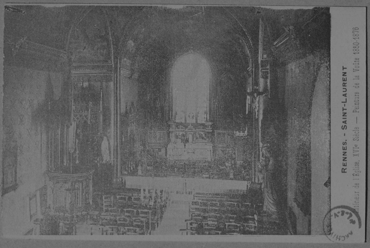 [1900 ca]. Rennes - Saint-Laurent. Intérieur de l'église, XVIe siècle - Peintures de la voûte 1850-1876. Carte postale, éd. Congrès Eucharistique de Rennes, [s.d] (A.D.35 : 6 Fi).