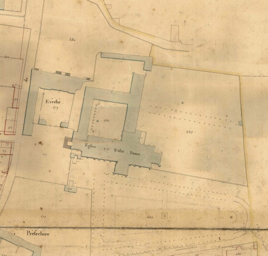 Parties constituantes non étudiéeséglise, cloître, bâtiment conventuel, logis abbatial, jardin, infirmerie, palais, dispensaire, hôpital, intendance, évêché