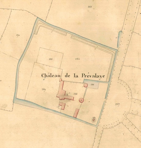 Les gravures du 19e siècle représentent un édifice apparemment inachevé ou tout du moins achevé à une date nettement postérieure, selon une formule simplifiée. Il est possible que la tour d´escalier réalisée devait recevoir son pendant au nord, à l´extrémité de l´aile principale. Les modèles du genre, plus ou moins riches et importants sont alors fréquents au commencement du 16e siècle en particulier dans le Val de Loire : l´important château de Goulaine, construit près de Nantes vers 1500 présente un tel parti à deux tours quasi identiques en vis à vis. Pour des raisons inconnues ce projet resté en suspens à la Prévalaye fut hâtivement bâclé au cours du 17e siècle. Les dessins et les lithographies du 19e siècle représentent ainsi le corps principal, à droite de la tour d´escalier : une élévation relativement banale dont l´étage est bas et mal proportionné et le toit anormalement dépourvu de toute lucarne de pierre digne d´une telle demeure. L´ajout d´un appentis en pan de bois masquant en partie la base de la tour contre le côté nord, bien visible sur les dessins du 19e siècle est un élément supplémentaire qui va dans le sens de cette interprétation.