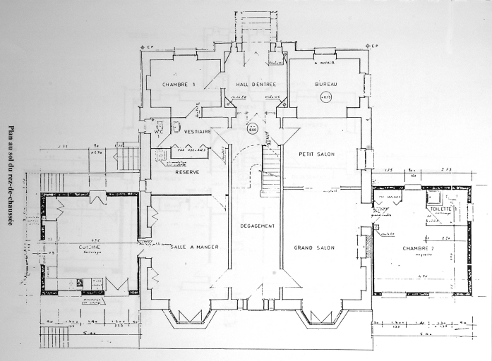 Le Taillis, plan du rez-de-chaussée, réalisé en vue de l'agrandissement du château (A. privées). In : SORIEUX, Aurore. Inventaire topographique des châteaux du 19e siècle en pays rennais. Cesson-Sévigné, Saint-Grégoire. Mém. maîtrise : Hist. Art : Rennes 2, Université de Haute-Bretagne : 2001-2002.