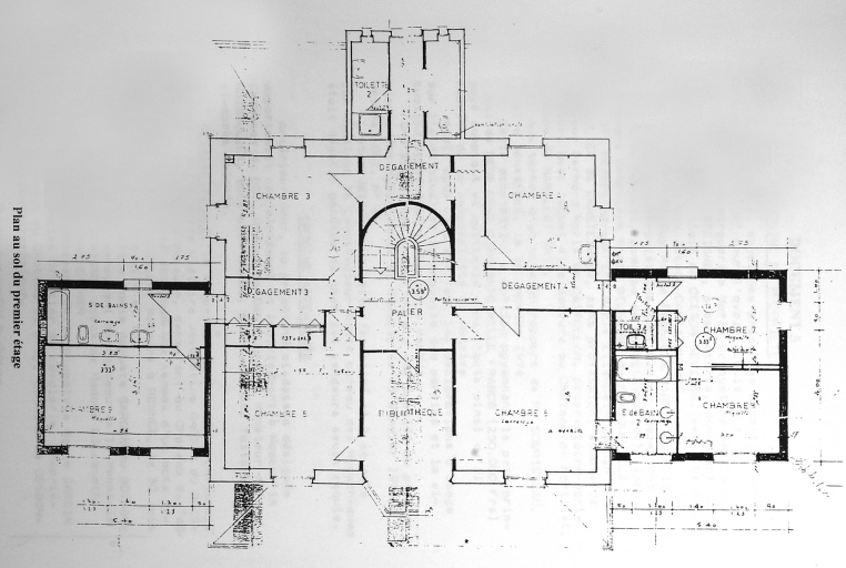 Le Taillis, plan du premier étage, réalisé en vue de l'agrandissement du château. In : SORIEUX, Aurore. Inventaire topographique des châteaux du 19e siècle en pays rennais. Cesson-Sévigné, Saint-Grégoire. Mém. maîtrise : Hist. Art : Rennes 2, Université de Haute-Bretagne : 2001-2002.