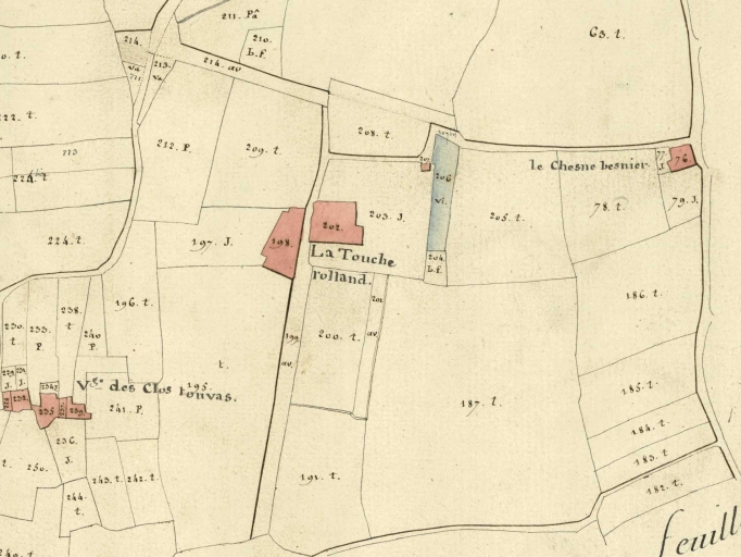 Plan parcellaire de la commune de Talensac. Section D, dite de la Touche-Rolland, 1ère feuille. Dessin, [Augier, géomètre, 15 février 1846], échelle 1/2000e. (A.D. Ille-et-Vilaine).