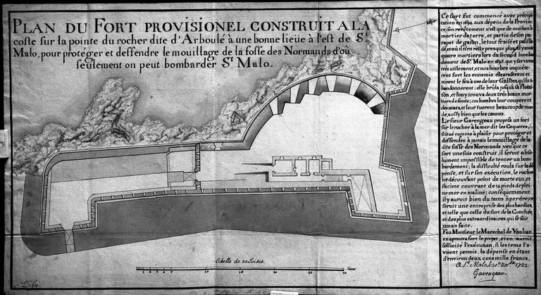Construit en 1694 sur les fonds de la Province, le fort d´Arboulé (aujourd'hui fort de la Varde) situé à une lieu à l´est de Saint-Malo avait pour mission de protéger le mouillage dit de la "fosse aux Normands". Le fort d´Arboulé était selon la formule en usage à l´époque une "batterie ou fort de campagne". Élevé en maçonnerie de moellons à mortier de terre, il était doté d´une batterie basse rayonnante munie de 8 canons et 2 mortiers et fermé à la gorge (à l'arrière) par un mur percé de créneaux de mousqueterie. L´ouvrage comprenait un souterrain au-dessus duquel avaient été construits les corps de garde des officiers et des soldats ainsi qu´un magasin à poudre voûté accessibles par une rampe inclinée. Lors de la deuxième attaque de Saint-Malo en 1695, les mortiers purent tirer sur la flotte ennemie et démontrer l´utilité de ce fort "provisionnel". Une "galère ennemie" fut incendiée et abandonnée sur le rivage et le Roi put ainsi récupérer "deux très beaux mortiers de fonte". Dans son plan fait à Brest le 25 septembre 1695, Vauban prévoyait l´augmentation du fort vers le sud. Finalement Garengeau, faute d´avoir pu fortifier le rocher dit "les Sillez ou les Grandes Côqueres" (aujourd’hui connu sous le nom de la Grande Côtière) choisit d´agrandir le fort au sud faisant bastion et entrée et de le doter en plus d´un bastion vers le nord-est...