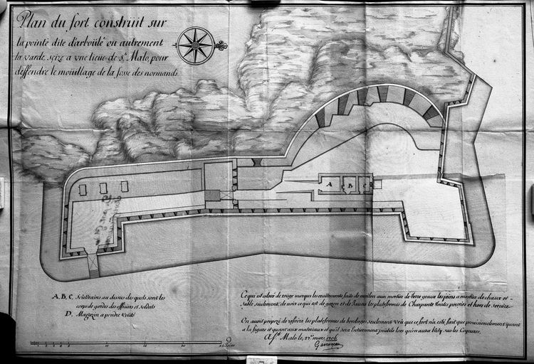 Dominant la mer de 25 m, la pointe de la Varde est située à un peu plus de quatre kilomètres de Saint-Malo. Suite à l’attaque anglo-hollandaise de 1693, un fort y est construit l’année suivante pour abriter une batterie de côte et une caserne avec corps de garde et magasin à poudre (le plan du 25 septembre 1695 signé de Vauban montre la partie nord du fort déjà construite). La fortification appelée "fort d’Arboulé", a pour objet de protéger le mouillage dit de la "fosse aux Normands".