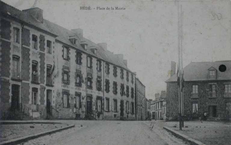 Hédé (I.-et-V.). La Mairie et la Grande Place. Carte postale éditée par A. Lamiré, éditeur, Rennes, [s. d.] (A.D. Ille-et-Vilaine 6 Fi).