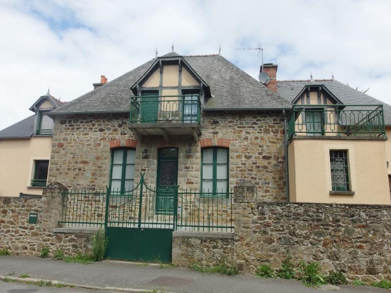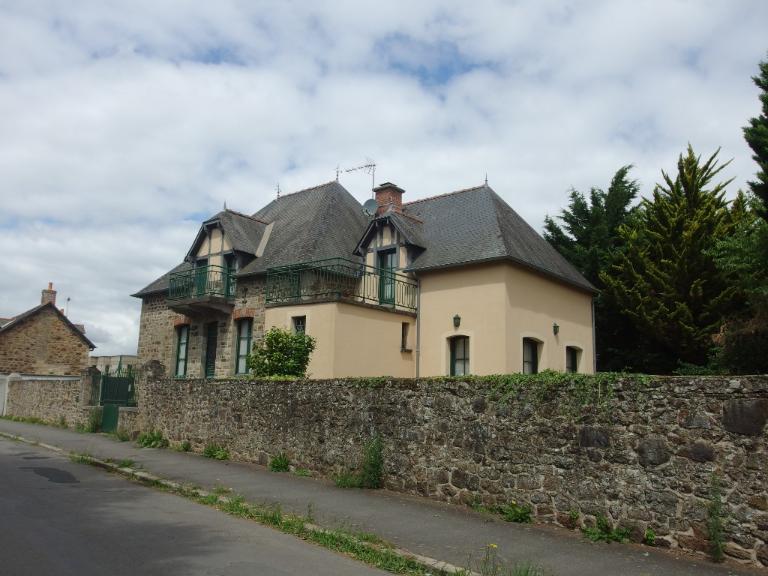 La maçonnerie de ce bâtiment est composée de moellon de granite et la toiture à croupes est couverte d'ardoise et surmontée d'épis de faîtage. Les encadrements de baies sont composés de fausses pierres moulées et de brique. Une grande lucarne en pan de bois couverte d'un toit à croupe éclaire le comble. A l'est, se trouve le jardin clos de murs.