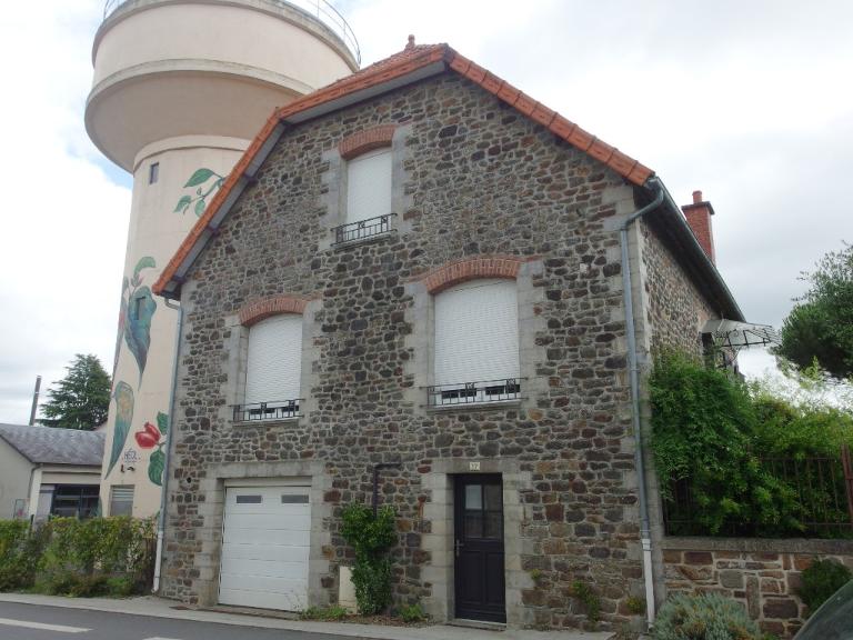 Cette maison en moellon de granite est couverte d'un toit à demi-croupes en tuile mécanique. La toiture est surmontée d'épis en terre cuite. Les encadrements de baies sont en brique.