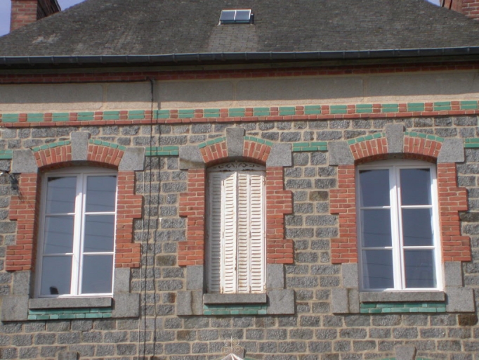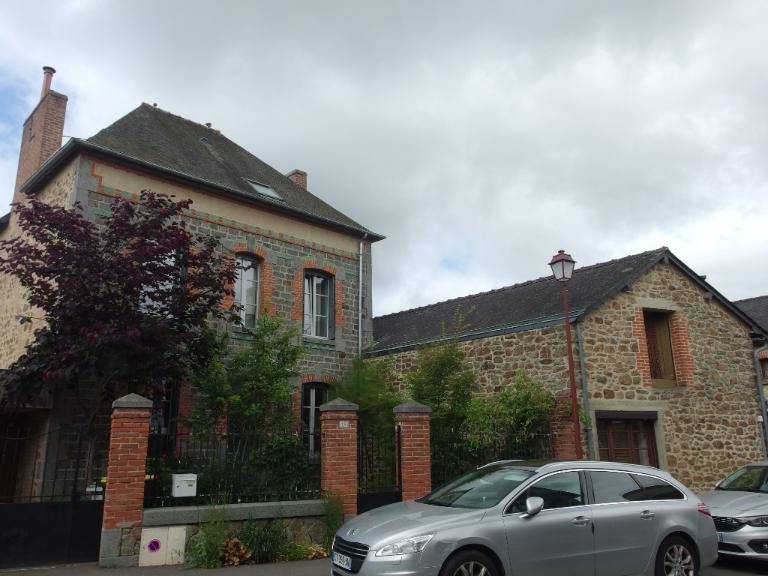 Cette maison possède une façade élevée en moellon équarri de granite alors que les autres murs sont réalisés en moellon. La toiture à croupes est couverte d'ardoise. De plus, la façade est percée de trois travées, composées de baies à encadrements de brique et de granite. Les chaînages d'angles sont en pierre de taille de granite. Les bandeaux, appuis de fenêtre, souches de cheminée sont réalisés en brique polychrome (rouge et verte). Le tirant métallique de la souche de cheminée sud forme la lettre "L".