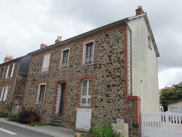 Cette maison en moellon de granite est élevée sur une cave. Elle possède une façade rythmée par trois travées, composées de baies à encadrements de brique. Ces baies possèdent des lambrequins.