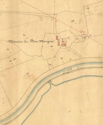 Les bâtiments de ce lieu sont représentés sur le premier cadastre réalisé pour la commune en 1835. Sur ce document, ce lieu est nommé Métairie du Bois Maigné. La construction des bâtiments de cette ferme est en effet datable de la fin du 18e siècle ; la date de 1797, portée sur une pierre de la grange, témoigne de cette époque de réalisation. La grange est en effet représentée sur le cadastre de 1835 ; toutefois elle a subi quelques transformations (portes murées...). Les porcheries et le fournil datent vraisemblablement également de la fin du 18e siècle puisqu'ils figurent aussi sur le cadastre de 1835. Le logis a été quelque peu remanié, cependant, à l'origine, il n'était composé que d'une pièce à feu et les baies de la façade se limitaient à la présence d'une fenêtre (porte actuelle) et d'une porte (fenêtre aujourd'hui). Ainsi, deux fenêtres ont été créées ultérieurement. Ce logis était probablement moins haut à l'origine et il devait posséder une pente de toiture beaucoup plus importante qu'aujourd'hui. Ainsi, c'est vraisemblablement au cours du 19e siècle que le bâtiment a été surélevé en terre afin de créer un surcroît plus important, et par là même, d'augmenter la surface de stockage des céréales. Il existait un manoir et une seigneurie au Bois Maigné, au 15e siècle, il appartenait à Raoul de Québriac.