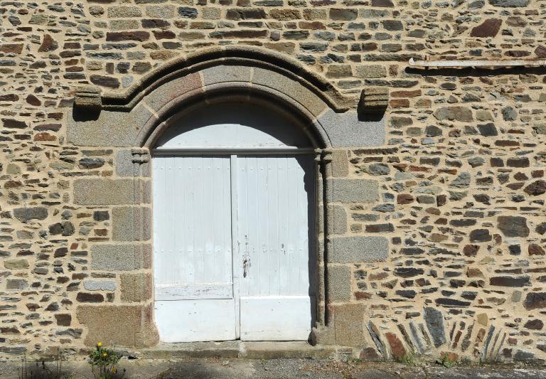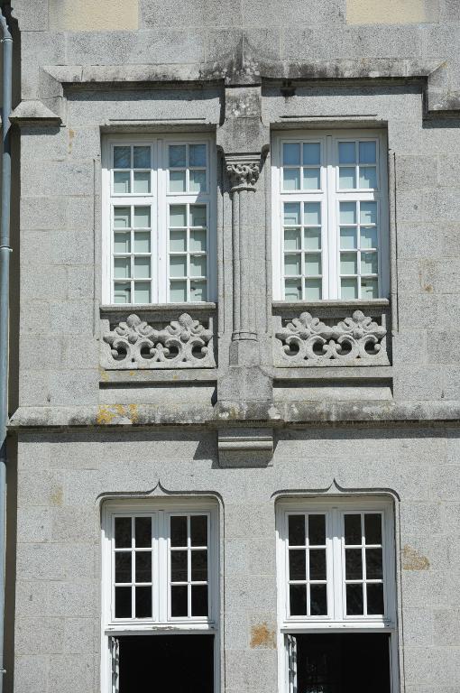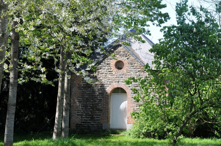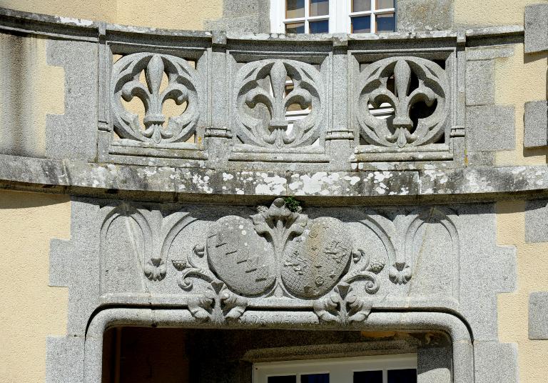 Sur l'arrière du château, le grand bâtiment des communs garde des traces d'une entrée et d'une fenêtre sculptées au 17e siècle.