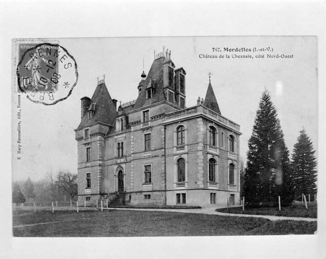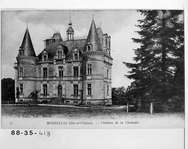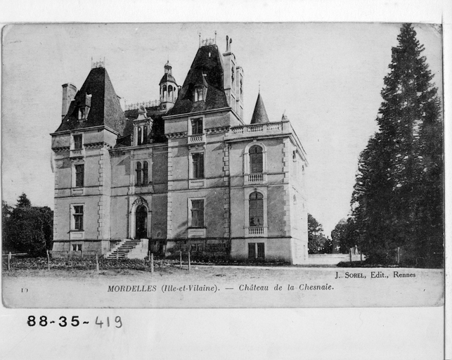 Orain écrit : 'On aperçoit près du bourg, sur la route de l'Hermitage, dans une jolie situation, un charmant château moderne, flanqué de deux tourelles. C'est la demeure de M. de Farcy, maire de Mordelles, conseiller général du canton'. L'édifice peut stylistiquement être daté de la 2e moitié du 19e siècle, et plus probablement du 3e quart ; il est à rapprocher des châteaux construits par Jacques Mellet dans les années 1860. Il a été construit sur le site d'un ancien manoir dont les ruines sont identifiables au sud du château.