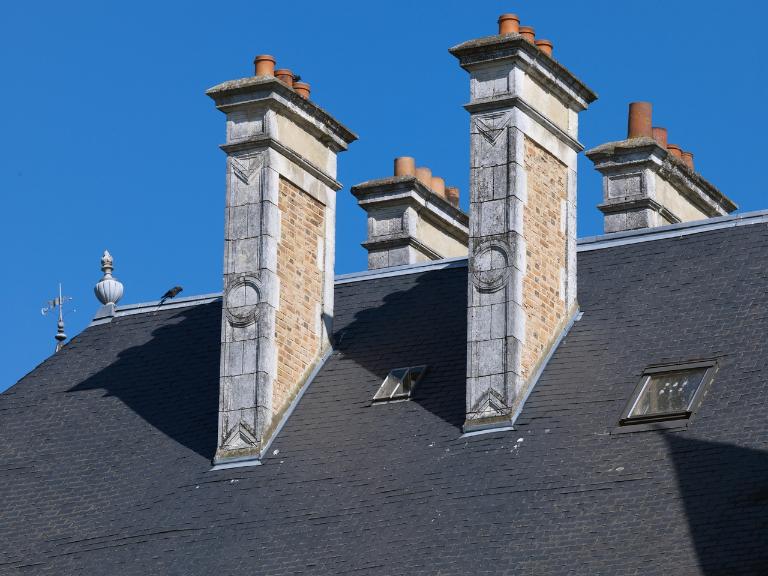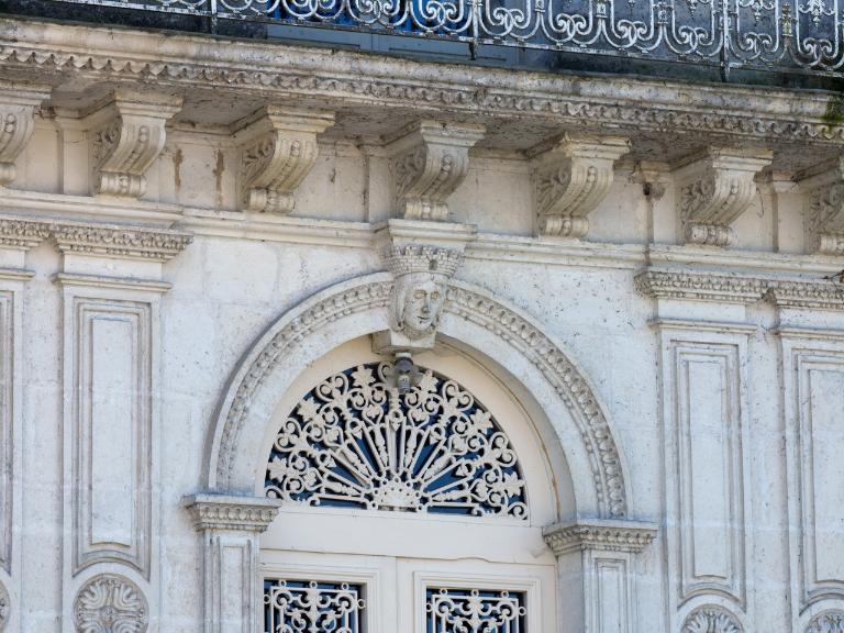 Les deux façades principales sont richement ornées en mettant l'accent sur les travées centrales par des éléments décoratifs de style néo-renaissance. Ce courant architectural se caractérise ici par la présence de pilastres, médaillons, frises grecques qui rythment la façade ternaire ; les lucarnes en sont un parfait exemple. Les décors sont davantage travaillés sur l'entrée originelle au nord.