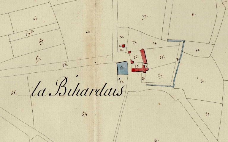 Bruz. Section C de la Bihardais en 2 feuilles, 1ère feuille Par Mrs Vauquetin et Villartay (1812), échelle 1/2500e (A. D. Ille-et-Vilaine).