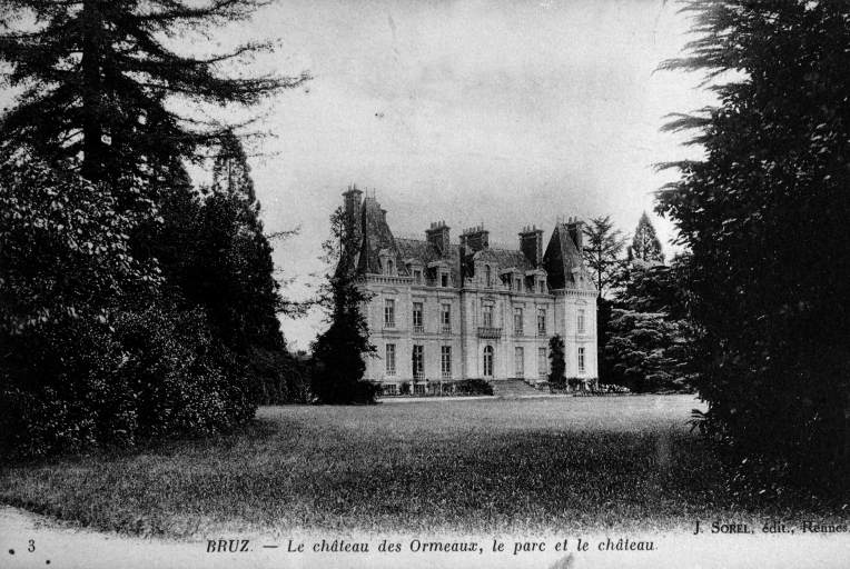 Bruz - Le Château des Ormeaux, le parc et le château. Carte postale. Sorel, J. (éditeur), Rennes, [s.d.].