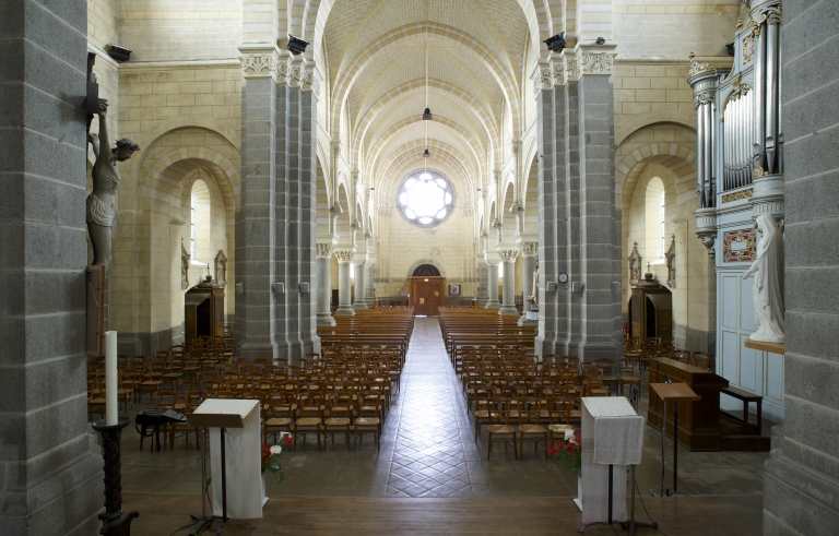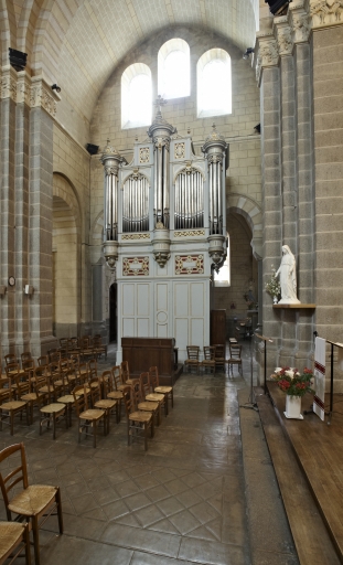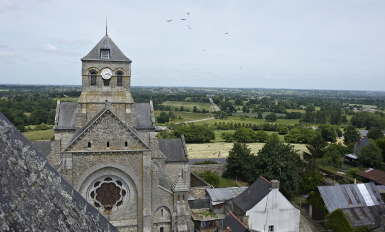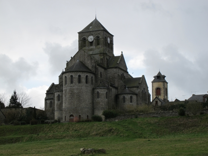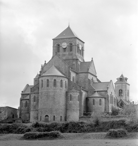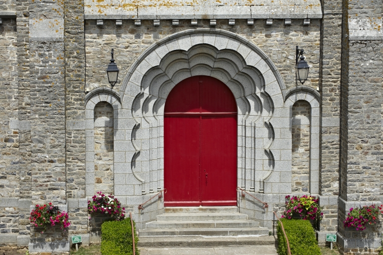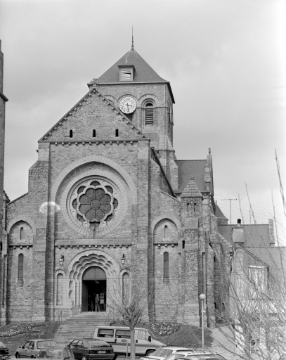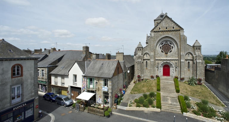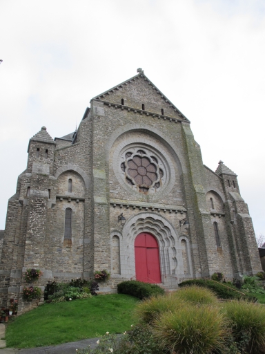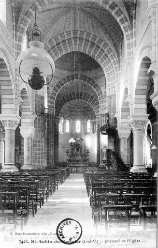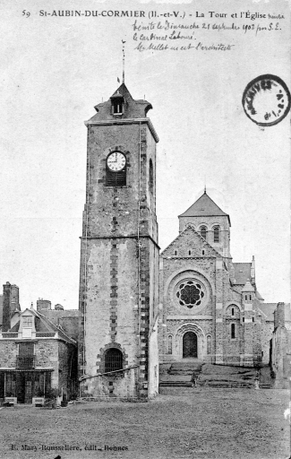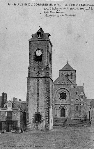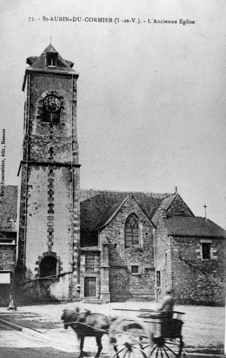 L'église de Saint-Aubin-du-Cormier est citée dès 1025 comme une possession de l'abbaye de Saint-Florent de Saumur. D'autres bâtiments religieux proches dépendaient également de cette abbaye ; c'est notamment le cas de l'ancien prieuré de Livré-sur-Changeon. Cette première église de Saint-Aubin-du-Cormier devient paroissiale lors de la création de la ville en 1225 ; les marquis de la Dobiaye en Saint-Jean-sur-Couesnon y possédaient une chapelle prohibitive. Cette église primitive, Saint-Malo-de-Bécherel, située au lieu-dit Bécherel (sud-est du château), est transférée en 1730 dans la chapelle seigneuriale qui se trouvait sur la Place Alexandre Veillard actuelle pour cause de ruine imminente. Cette chapelle seigneuriale était composée d'une simple nef à laquelle deux chapelles avaient été ajoutées au sud. Elle présentait une porte en arc brisé et une rose du 14e siècle ; la fenêtre du chevet possédait un vitrail représentant le Jugement Dernier et datait du début du 16e siècle. Elle était semble-t-il dédiée à Notre-Dame, alors qu'une chapelle Saint-Aubin construite dans les années 1430 se trouvait dans l'enceinte même du château. La tour qui se trouve toujours actuellement sur la Place Alexandre Veillard a été édifiée en 1764, peu de temps après la conversion de la chapelle seigneuriale en église paroissiale. Elle était située au sud de la nef et remplaçait l'ancien clocher tombé en ruines. Cette tour servait probablement de clocher à l'église qui a été détruite peu de temps après la construction d'un nouvel édifice religieux un peu plus au nord. Cette tour a ensuite été convertie en beffroi. Le presbytère se trouvait au 17e siècle au lieu-dit Bécherel, sur sa porte, étaient gravées la date de 1680 ainsi que les armoiries du roi. L'église actuelle a été reconstruite entre 1899 et 1902 par l'entrepreneur Richer sur les plans de Henri Mellet. Cet architecte, natif de Vitré, a construit de nombreux édifices religieux dans le département à la fin du 19e siècle (chapelle de la Peinière, église de Janzé, église de Saint-Etienne-en-Coglès, église Saint-Martin de Vitré...). Cette église a été reconstruite à quelques mètres au nord de l'ancienne, qui était devenue trop petite. Le cabinet Mellet présente les premiers plans en 1889. L'église, de style romano-byzantin, est bénie le 21 décembre 1902. Le propre de l'architecture du cabinet Mellet est de faire référence à de multiples styles architecturaux du passé ; cette église illustre cette habitude car, on y retrouve des sortes de tourillons en façade sud qui font référence au style roman poitevin ou encore, sur la même façade, un fronton triangulaire orné de modillons qui rappelle l'architecture néo-classique du début du 19e siècle. Par ailleurs, l'abside est percée de fenêtres en plein cintre qui évoquent également l'art roman, alors que l'intérieur est couvert des voûtes sur croisées d'ogives si caractéristiques de l'architecture religieuse gothique. Le chevet de cette église est très comparable à celui de l'église paroissiale Saint-Etienne de Saint-Etienne-en-Coglès réalisée par le même cabinet d'architectes. Cet édifice n'est pas orienté, au contraire des autres églises qui possèdent généralement un choeur à l'est, tourné vers la ville sainte de Jérusalem. Il est logique d'imaginer que la reconstruction d'un tel édifice en milieu urbain au début du 20e siècle soit la cause de cette "désorientation". L'édifice est précédé d'un perron dont les marches sont composées de réemplois d'anciennes pierres tombales. Le mobilier est contemporain de la construction de l'église sauf quelques rares éléments qui sont plus anciens que l'édifice ; comme l'orgue situé dans le bras ouest du transept. Le maître-autel a été donné en 1902 par le Père Jean-Evangéliste-Marie DUVER, curé de Saint-Germain de Rennes. Il est également le commanditaire de la chapelle Saint-Denis construite à la fin du 19e siècle dans le cimetière.