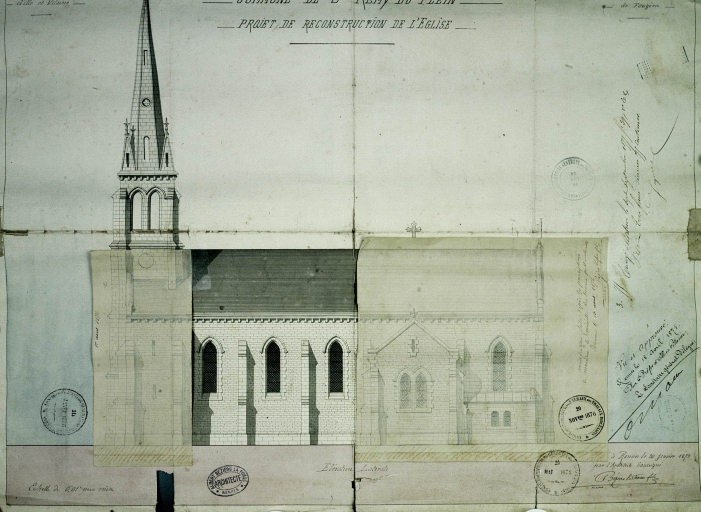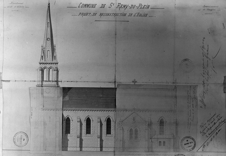 COMMUNE DE St REMY-DU-PLEIN PROJET DE RECONSTRUCTION DE L'EGLISE, Elévation latérale. Dessin, par Albert Béziers la Fosse Fils, architecte, 1873. Papier, encre, aquarelle, échelle 1 : 100e. (A.D. Ille-et-Vilaine).