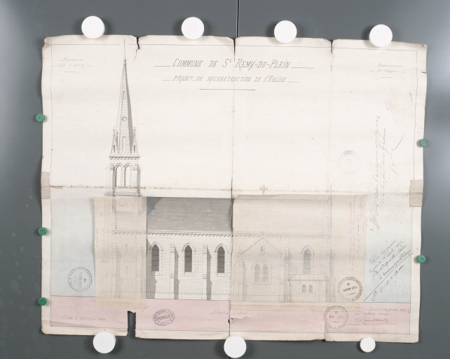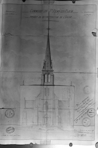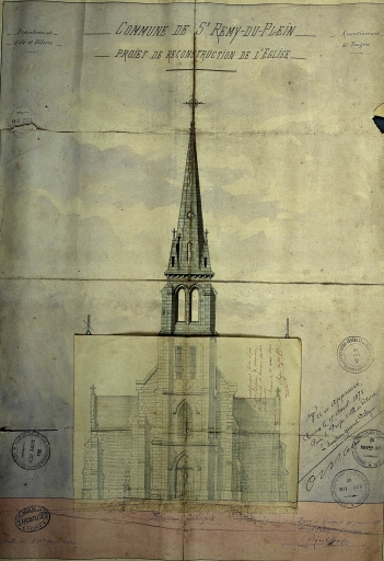 COMMUNE DE St REMY-DU-PLEIN PROJET DE RECONSTRUCTION DE L'EGLISE, Elévation principale. Dessin, par Albert Béziers la Fosse Fils, architecte, 1873. Papier, encre, aquarelle, échelle 1 : 100e. (A.D. Ille-et-Vilaine).