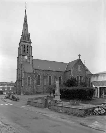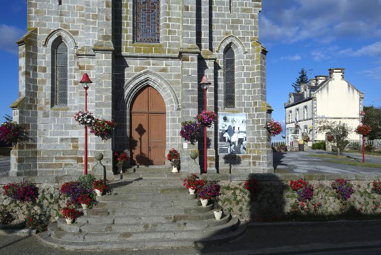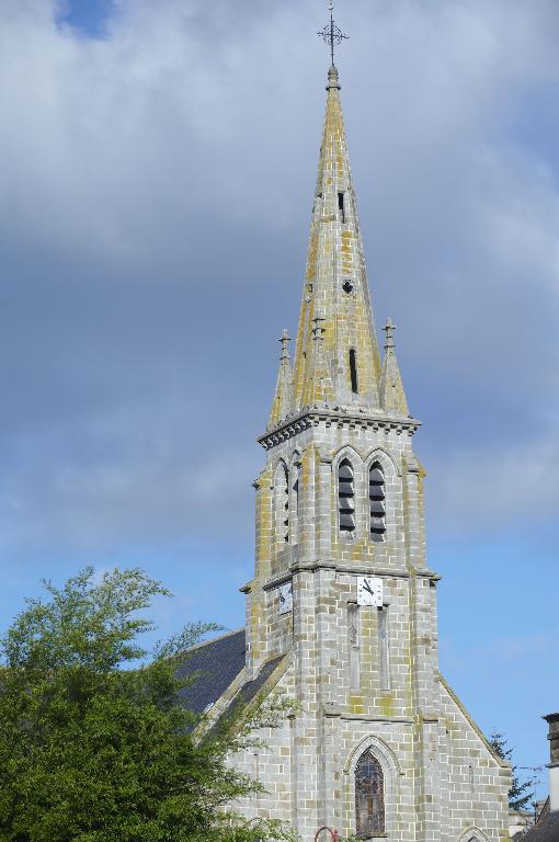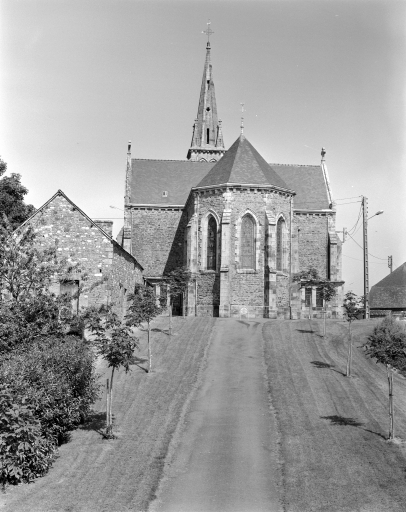 L’église est implantée au cœur du village, le long de la RD90. Elle est élevée en granite local. La maçonnerie des murs est constituée de moellons de granite gris alors que le soubassement, les contreforts, les contours de baies et la façade principale sont réalisés en pierre de taille de granite bleu. La toiture à longs pans et pignons découverts est couverte d’ardoise. L’église, dont le chœur est orienté à l’ouest, présente un plan classique en croix latine. L’entrée de l’église, qui se fait par un emmarchement à huit degrés, donne directement sur la route. La nef unique comprend trois travées, le chœur à une travée présente un chevet arrondi à trois pans. En matière de décors, l’ensemble de l’édifice est assez sobre. Une corniche à modillons couronne les murs. Les baies en arc brisé sont toutes identiques. Les pignons nord et sud du transept portent une croix sur leur sommet. Le clocher-porche est surmonté d’une flèche en pierre portant quatre clochetons.